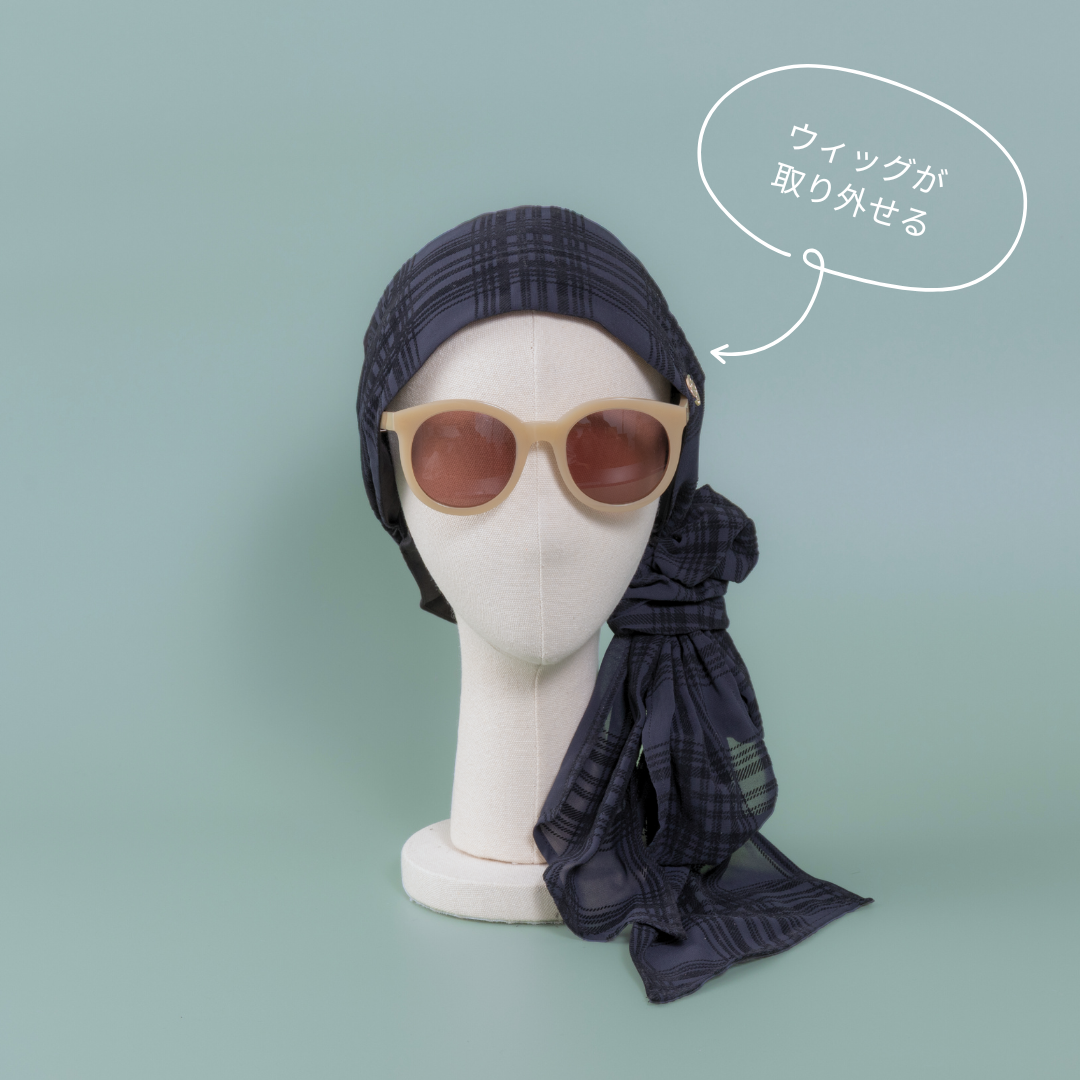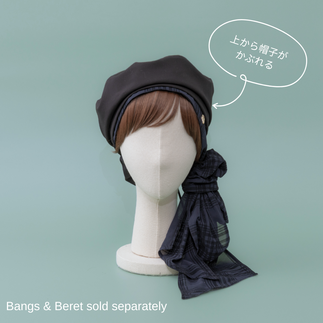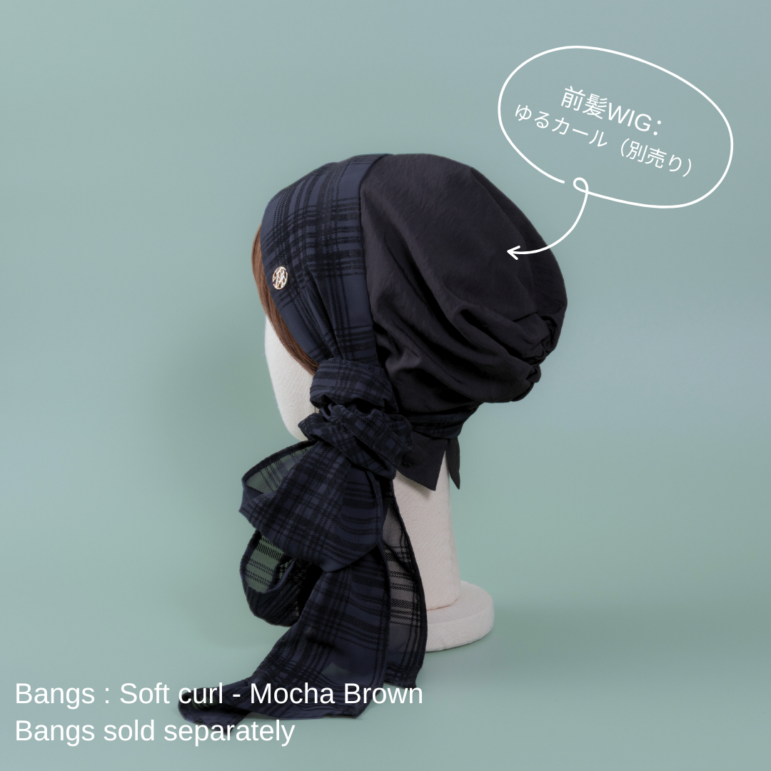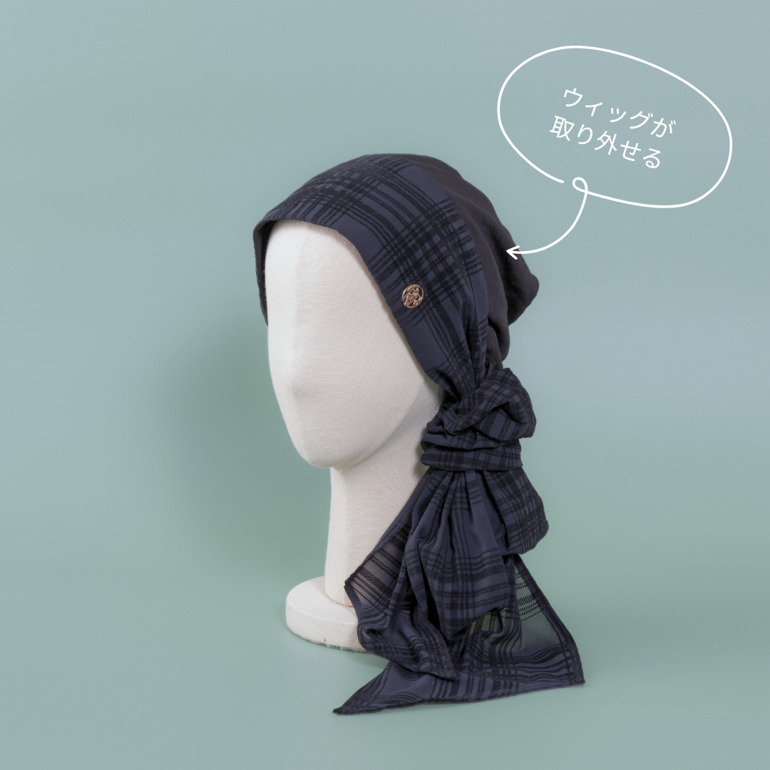 合わせる前髪ウィッグ次第で、印象がガラリと変わる楽しいスカーフハットです。