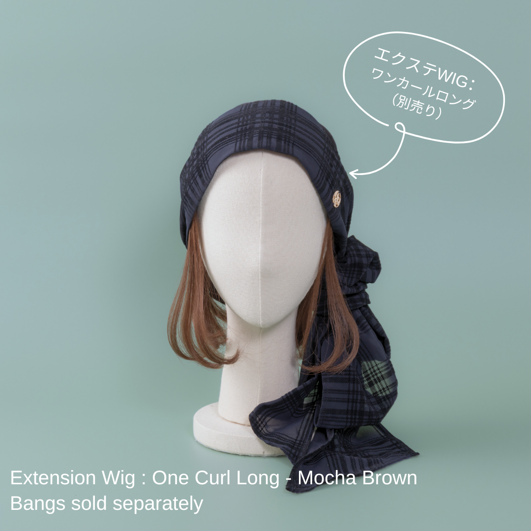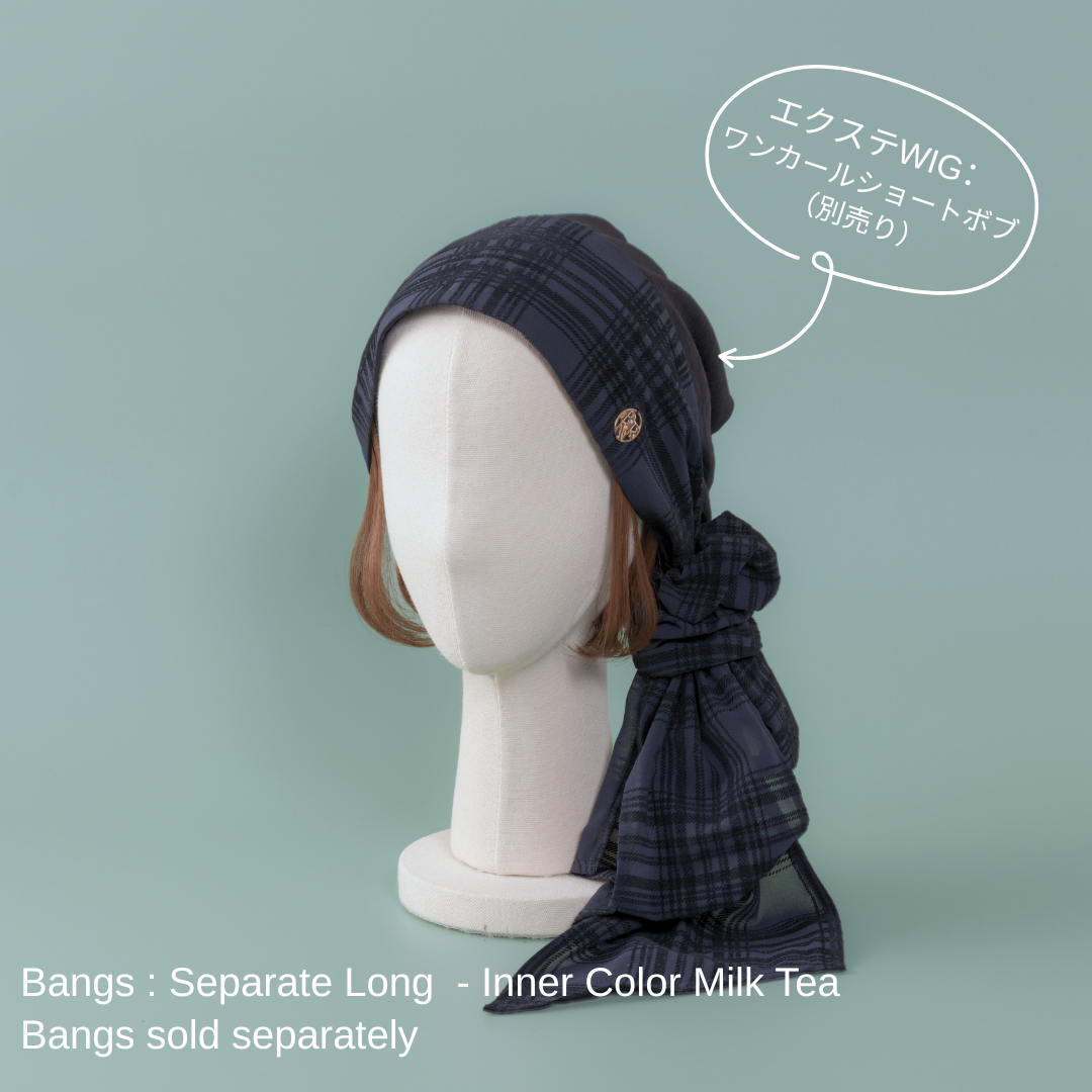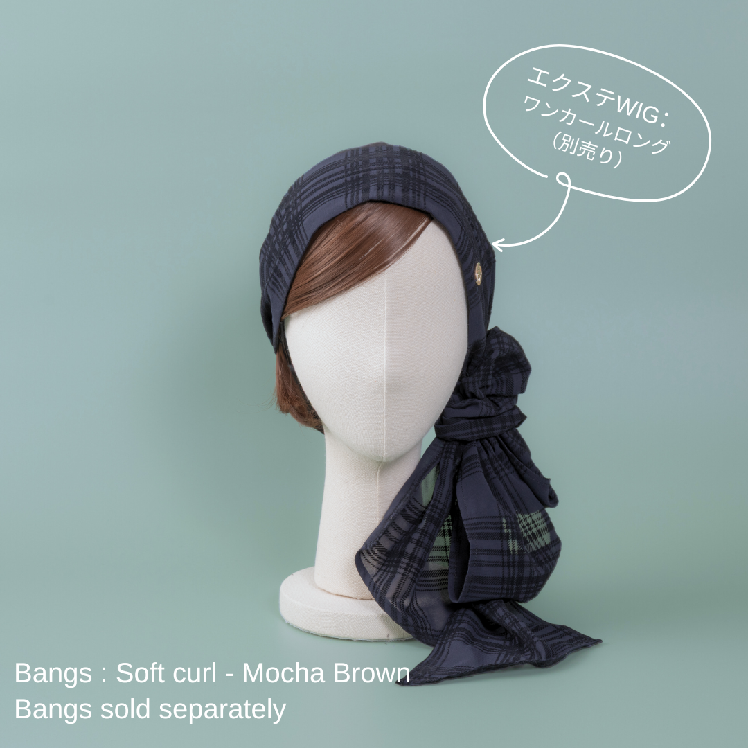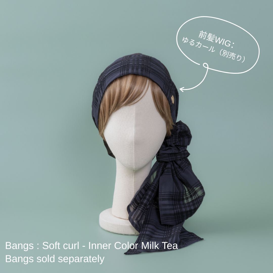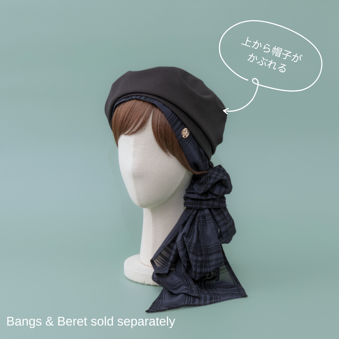 合わせる前髪ウィッグ次第で、印象がガラリと変わる楽しいスカーフハットです。