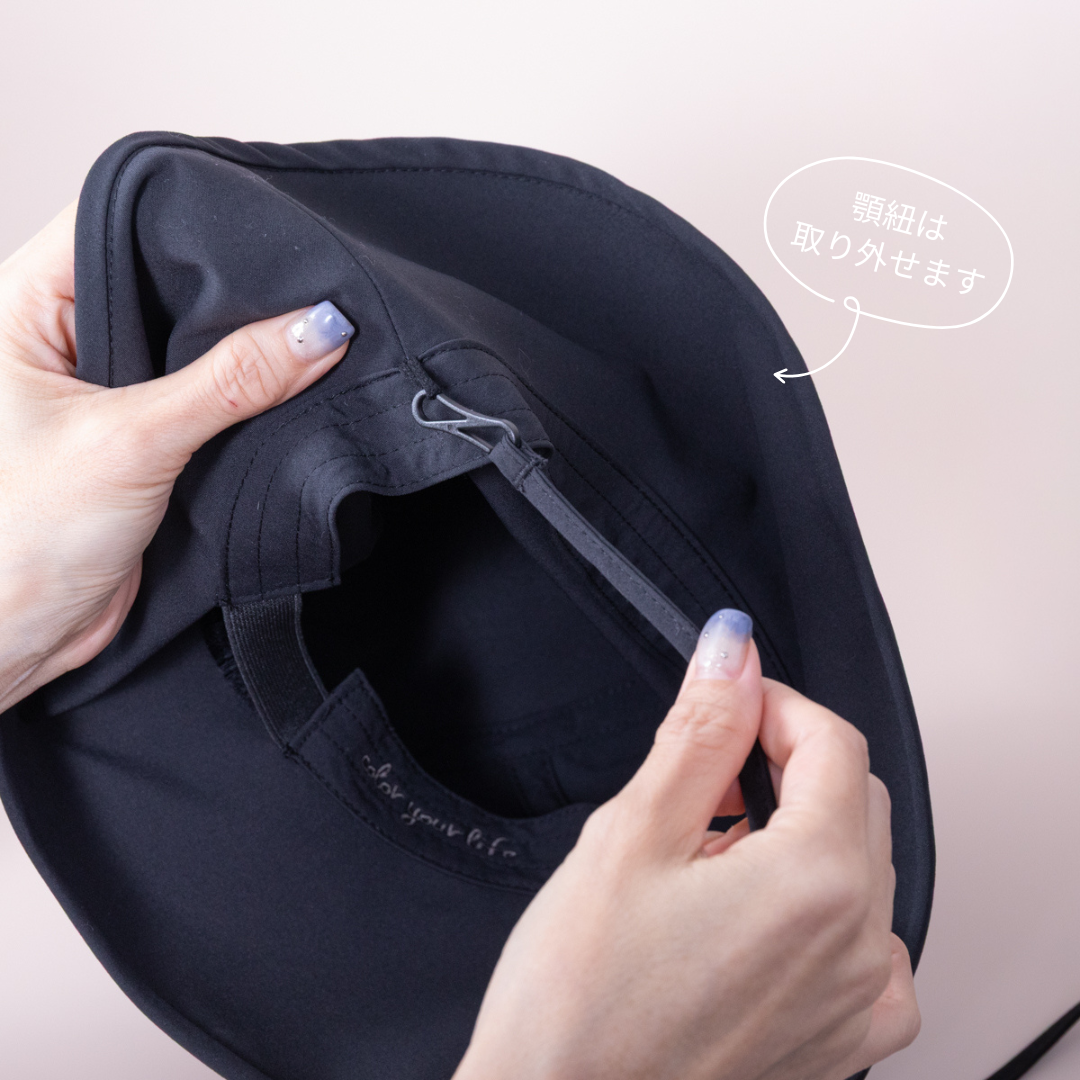 • 機能美: ストラップは取り外し可能。風の強い日は機能的に、お出かけ先ではシックなハットとして、シーンに合わせて使い分けられます。