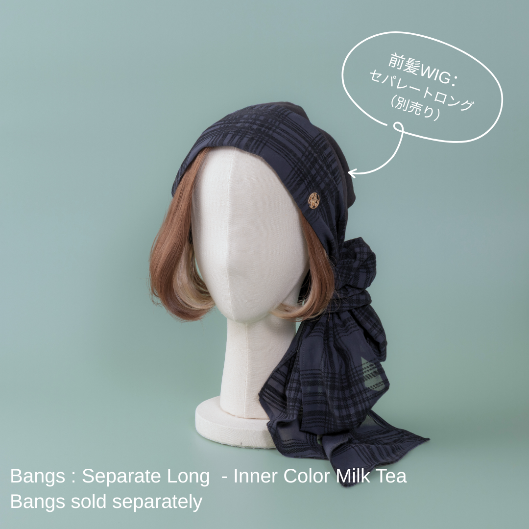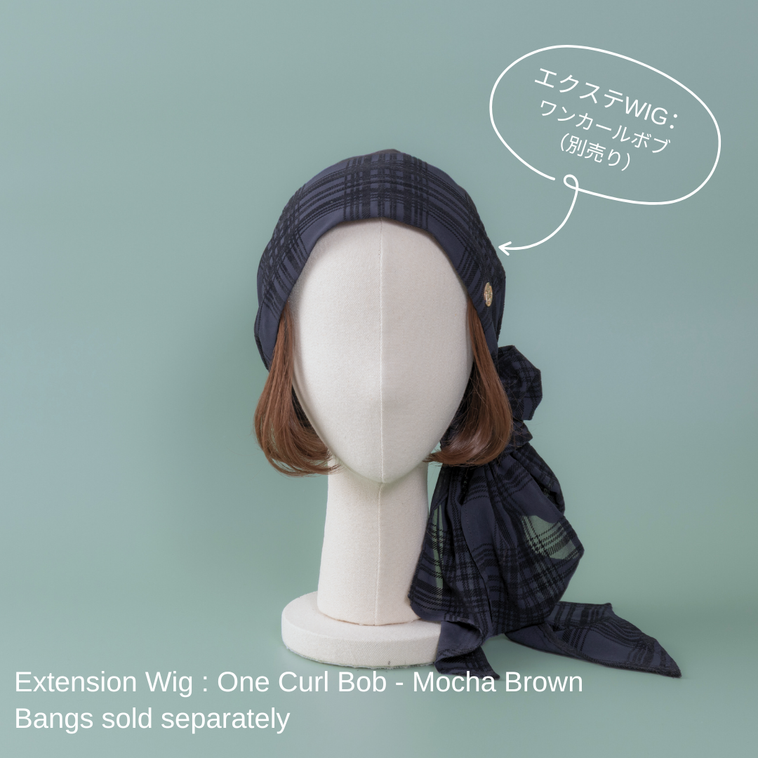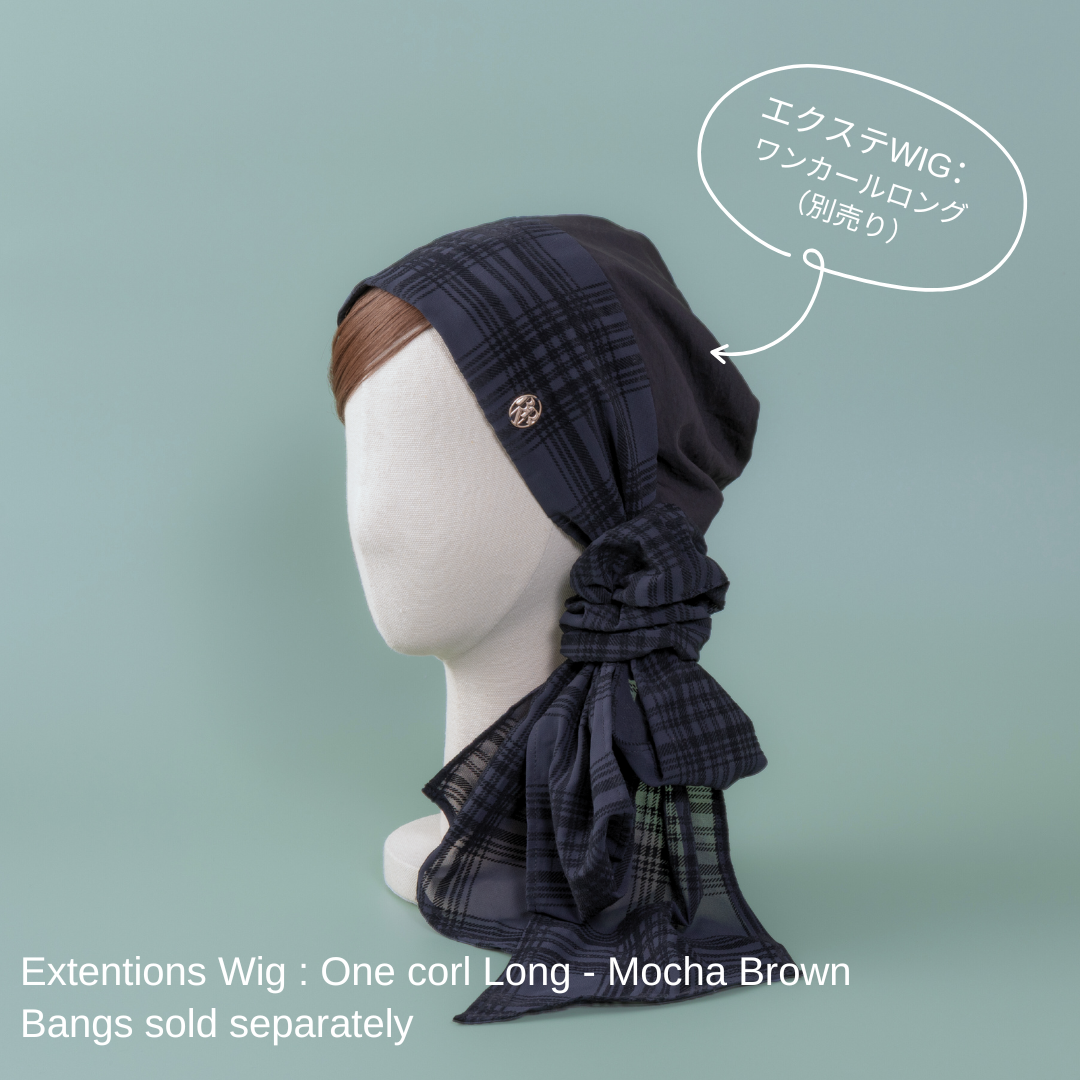 合わせる前髪ウィッグ次第で、印象がガラリと変わる楽しいスカーフハットです。